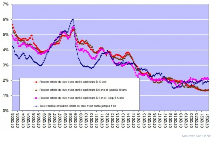 Les taux d'intérêt des crédits hypothécaires sont restés très attractifs au cours du dernier trimestre. Sur la base des chiffres publiés par la Banque Nationale de Belgique, ces taux oscillaient en août entre 1,36% (pour les crédits à taux fixe ou à taux variable assortis d’une période initiale de fixité du taux de plus de plus de 5 ans et jusque 10 ans) et 2,09% (pour les crédits assortis d’une période initiale de fixité du taux de plus d’1 an et jusque 5 ans).