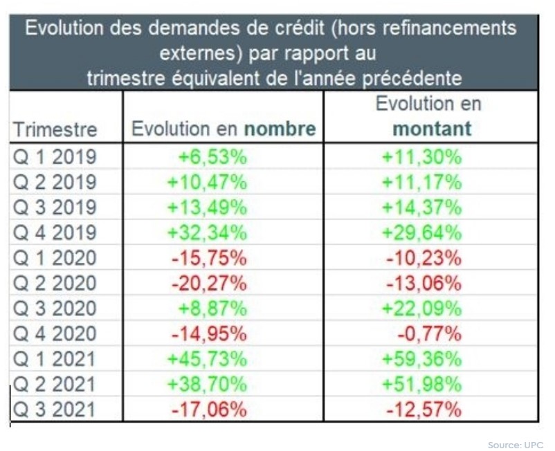 Le nombre de demandes de crédit a connu au troisième trimestre 2021 une diminution d’environ 17%, hors refinancements, par rapport au troisième trimestre de 2020. Il est à noter que ce troisième trimestre 2020 faisait directement suite à la levée du confinement, ce qui avait entraîné une reprise des demandes de crédit. Le montant de crédit correspondant durant ce troisième trimestre 2021 a également enregistré une diminution, d’environ 12,5%.