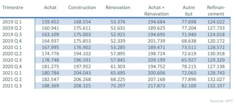 Le montant moyen d’un crédit pour l’achat d’un logement + rénovation a connu une forte augmentation au troisième trimestre, pour atteindre un montant de presque 218.000 EUR. Ceci ne représente toutefois "qu’une" augmentation d’environ 23.000 EUR (soit 12%) depuis début 2019.