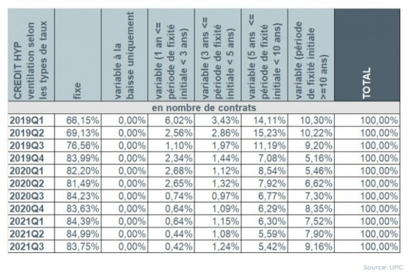 Au cours du troisième trimestre 2021, plus de 9 emprunteurs sur 10 (92,9%) ont à nouveau opté pour un taux d’intérêt fixe ou un taux d’intérêt variable assorti d’une période initiale de fixité des taux de minimum 10 ans. Un peu plus de 6,5% des emprunteurs ont privilégié un taux d’intérêt variable assorti d’une période initiale de fixité des taux entre 3 et 10 ans. Le nombre d’emprunteurs ayant choisi un taux variable annuellement s’est élevé à moins de 0,5%.