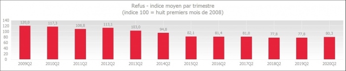 En dépit du contexte économique difficile dans lequel nous nous trouvons, le taux de refus au deuxième trimestre 2020 reste peu élevé par rapport à l'ensemble des deuxièmes trimestres des années précédentes.