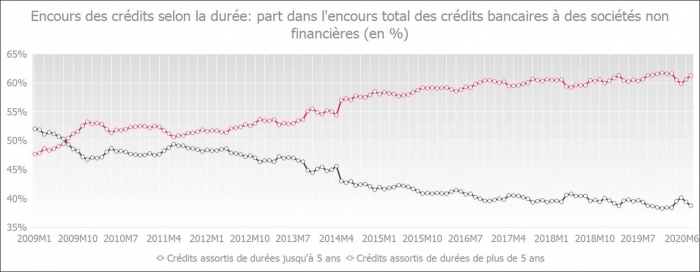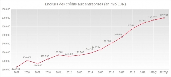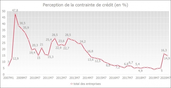 L'enquête trimestrielle réalisée par la Banque nationale de Belgique (BNB) indique que la perception des freins au crédit par les entreprises était de 14,9 % en juillet 2020. Le pourcentage est passé de 5,0 % en janvier à 16,3 % en avril, pour redescendre à 14,9 % en juillet. Cette évolution montre que la perception des freins au crédit est toujours significativement plus faible que durant la crise bancaire de 2008 - 2009, où elle a atteint un pic de près de 50 %.