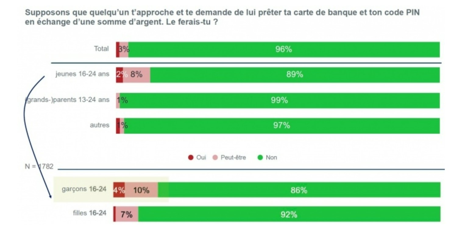 Les garçons semblent également plus sensibles aux belles paroles des criminels que les filles. 8 % des filles semblent tentées par l’idée de gagner de l'argent en « se contentant » de prêter leur compte et/ou leur carte bancaires. Dans le cas des garçons, on parle de plus de 14 %.