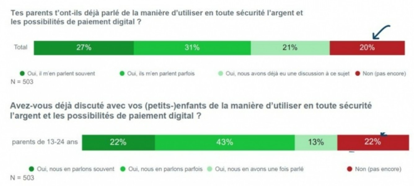 Les jeunes ne saisissent pas les dangers de cette pratique notamment parce que leurs parents ou grands-parents ne leur parlent guère de la manière dont il convient d’agir pour gérer l'argent et les possibilités numériques en toute sécurité. Seul 1 jeune sur 4 déclare qu’il s'agit là d'un sujet de discussion fréquent à la table familiale. Dans 1 cas sur 5, cette question n'est jamais discutée.