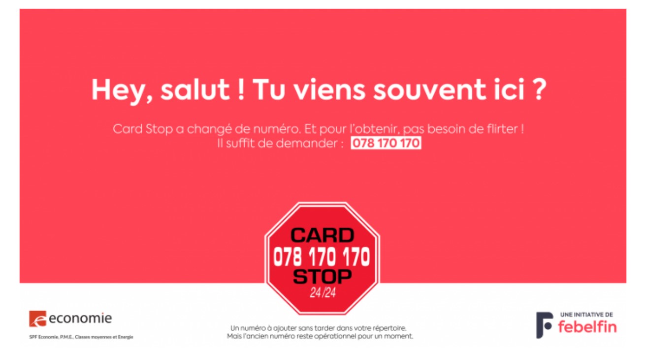 « Tout le monde ou presque connaît Card Stop qui permet de bloquer sa carte de banque en cas de perte ou de vol. Aujourd’hui, ce numéro change pour arrêter les surcoûts facturés aux consommateurs. Ce changement favorable aux consommateurs participe à rendre les services bancaires plus accessibles. Afin de faire connaître le nouveau numéro au public, le SPF Economie soutient cette campagne d’information. »