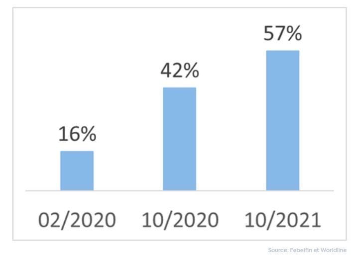 En outre, les paiements sans contact sont de plus en plus courants : en octobre 2021, pas moins de 57 % des paiements par carte ont ainsi été effectués sans contact. Le fait que cela reste un moyen de paiement facile et sûr y contribue assurément