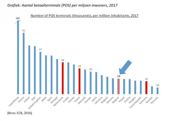 Het feit dat er nog een inhaalbeweging mogelijk is bij de Belgische handelaars wordt ook bevestigd door de cijfers van de Europese Centrale Bank. Volgens de ECB beschikt België over 16.000 betaalterminals in winkels (POS) per miljoen inwoners. Hiermee bengelt ons land aan de staart van het Europees peloton. In Denemarken beschikt men immers over 23.000 betaalterminals per miljoen inwoners en Nederland spant de kroon met 29.000 betaalterminals per miljoen inwoners.