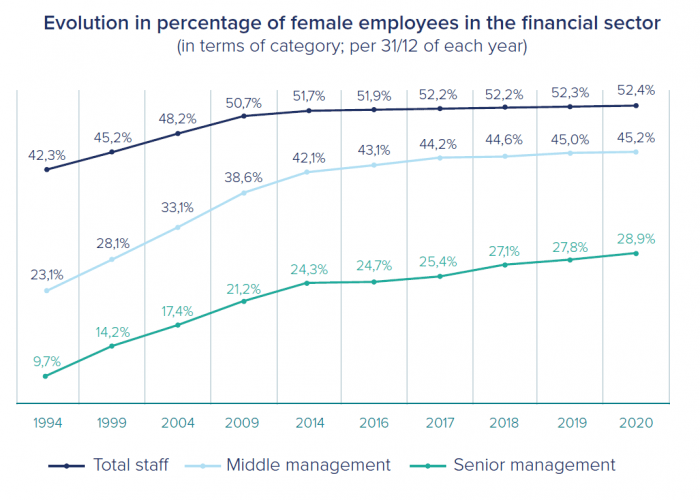 De enquête toont aan dat de gendergelijkheid binnen de financiële sector op drie vlakken verbeterd is: