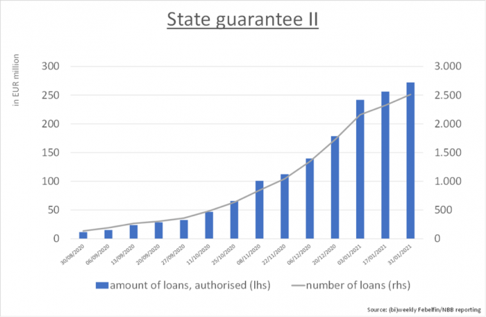 - Staatswaarborg-regeling 1: Deze garantieregeling is afgelopen, er werd voor 1,739 miljard euro (per 3/01/2021) gebruik van gemaakt (toegekende bedragen). Dit uitstaande bedrag zal nu geleidelijk dalen, gezien deze kredieten geleidelijk aan op eindvervaldag komen. Deze garantieregeling kon worden gebruikt voor kredieten aan alle ondernemingen, voor een maximale looptijd van 1 jaar.