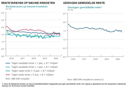 - Bovendien gebeurt deze kredietverlening aan bijzondere lage tarieven, die gunstig zijn voor de ondernemers. Volgens gegevens van de NBB lag de gewogen gemiddelde rente op nieuwe bedrijfskredieten in november 2020 op een heel laag niveau, namelijk 1,41% (tegen 1,52% in augustus 2020).