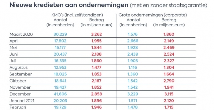 Het aantal toegekende ondernemingskredieten blijft stabiel. Aan 1.478 grote ondernemingen werd in februari 2021 een nieuw krediet toegekend. Dit komt overeen met wat we zagen in maart 2020: toen lag het aantal op 1.576. Ook het onderliggende bedrag is nagenoeg hetzelfde: 1,86 miljard euro in maart 2020 tegenover 1,71 miljard euro in februari 2021.