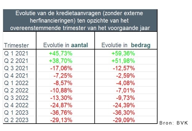 Het aantal kredietaanvragen (excl. deze voor herfinancieringen) is in het tweede trimester van 2023 gedaald met iets meer dan 29% ten opzichte van het tweede trimester van 2022. Het bedrag van de kredietaanvragen daalde eveneens met ongeveer 29% ten opzichte van 2022. Er werden zodoende iets meer dan 70.000 kredietaanvragen ingediend voor een totaalbedrag van bijna 13 miljard EUR.