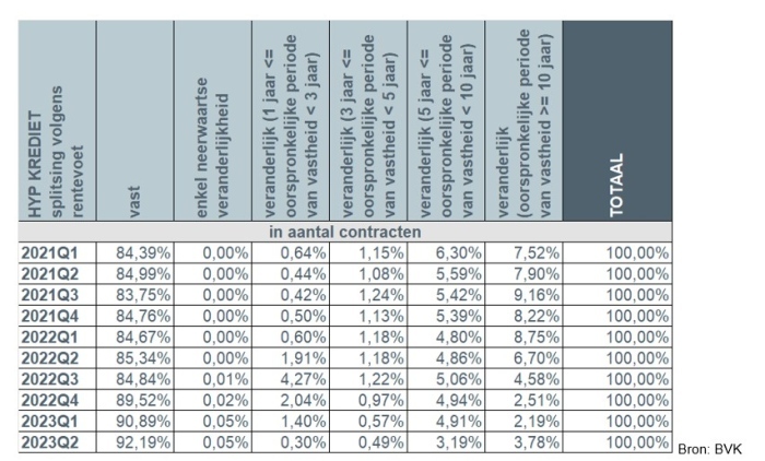 In het tweede trimester van 2023 kozen opnieuw meer dan 9 op 10 kredietnemers, meer bepaald 96%, voor een vaste rentevoet of een veranderlijke rentevoet met een initiële periode van rentevastheid van minimum 10 jaar. Ongeveer 4% van de kredietnemers opteerde voor een veranderlijke rentevoet met een initiële periode van rentevastheid tussen 3 en 10 jaar. Nauwelijks 0,3% van de kredietnemers opteerde nog voor een jaarlijks veranderlijke rentevoet.