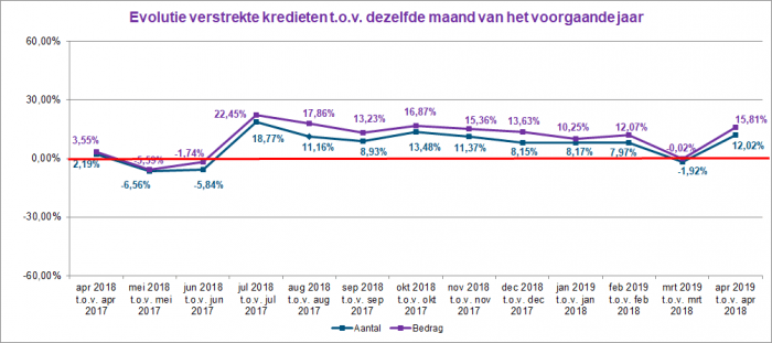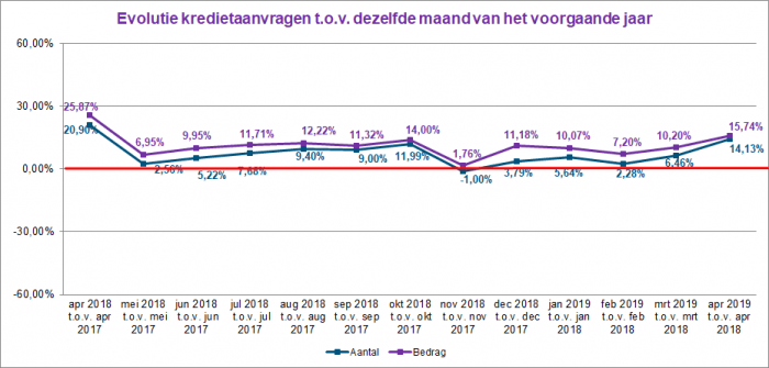 Het aantal kredietaanvragen steeg in april 2019 met 14% ten opzichte van april 2018. Het overeenstemmende totaalbedrag van deze aanvragen lag bijna 16% hoger. In april 2019 steeg het aantal verstrekte kredieten met 12%. In bedrag is bijna 16% meer krediet verleend dan in april 2018.