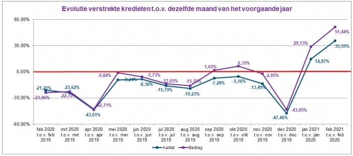 Het aantal kredietaanvragen steeg in februari 2021 met iets meer dan 41% ten opzichte van februari 2020. Het overeenstemmende totaalbedrag van deze aanvragen lag zelfs bijna 56% hoger.