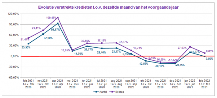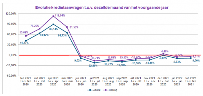 Het aantal kredietaanvragen daalde in februari 2022 met ongeveer 9% ten opzichte van februari 2021. Het overeenstemmende totaalbedrag van deze aanvragen lag 4,3% lager. In februari 2022 bleef het aantal verstrekte kredieten ongeveer stabiel (-0,5%). In bedrag werd bijna 9% meer krediet verleend dan in februari 2021.