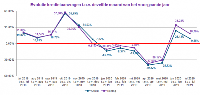 Het aantal kredietaanvragen steeg in juli 2020 met 9,5% ten opzichte van juli 2019. Het overeenstemmende totaalbedrag van deze aanvragen lag eveneens bijna 19% hoger.