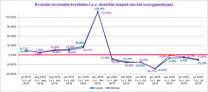 In juli 2020 daalde het aantal verstrekte kredieten met bijna 16%. In bedrag is ongeveer 13,5% minder krediet verleend dan in juli 2019.