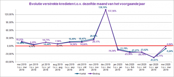 In mei 2020 lag het aantal verstrekte hypothecaire kredietovereenkomsten iets meer dan 9% lager dan in mei 2019. Het overeenstemmende kredietbedrag daalde slechts licht, met bijna 1%.