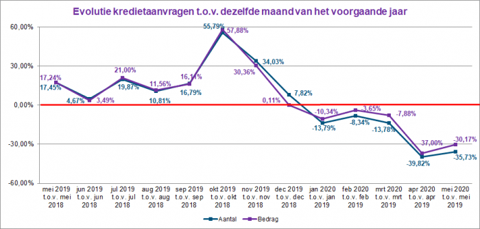 In mei 2020 daalde het aantal aanvragen voor een hypothecair krediet met bijna 36% in vergelijking met mei 2019. In bedrag was er eveneens een daling met 30% ten opzichte van vorig jaar.