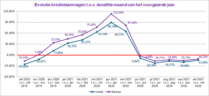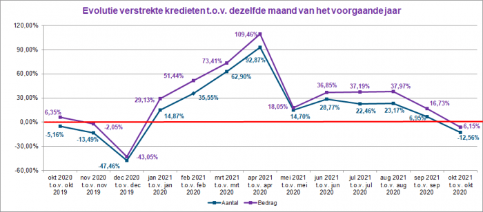 In oktober 2021 daalde ook het aantal verstrekte kredieten met ongeveer 13%. In bedrag werd iets meer dan 6% minder krediet verleend dan in oktober 2020.