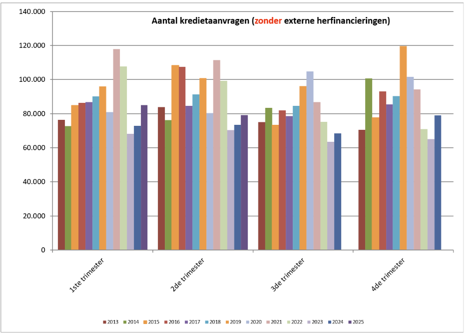 In het tweede kwartaal van 2025 is het aantal kredietaanvragen met ongeveer 7,7% gestegen in vergelijking met dezelfde periode vorig jaar, exclusief herfinancieringen. Ook het overeenkomstige aangevraagde bedrag steeg in het tweede kwartaal van 2025, met ongeveer 16%.