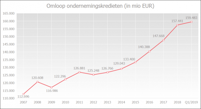 Eind maart 2019 stond er een nieuw record aan krediet aan ondernemingen uit bij de Belgische banken: 159,5 miljard euro. Op jaarbasis is dit een stijging van 4,9%.