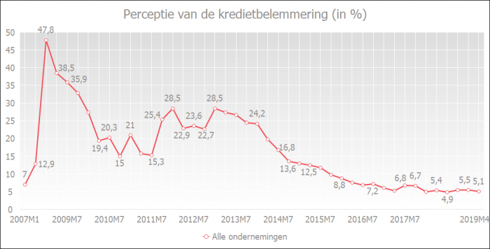 De Belgische ondernemingen lieten in de periodieke enquête van de NBB optekenen dat ze minder kredietbelemmeringen ervaren. De perceptie van de kredietbelemmering blijft historisch laag. In april 2019 beschouwden 5,1% van de ondernemingen de kredietvoorwaarden als ongunstig. Hiermee bevindt de indicator van kredietbelemmering zich op het op één na laagste niveau sinds de start van de metingen in 2003.