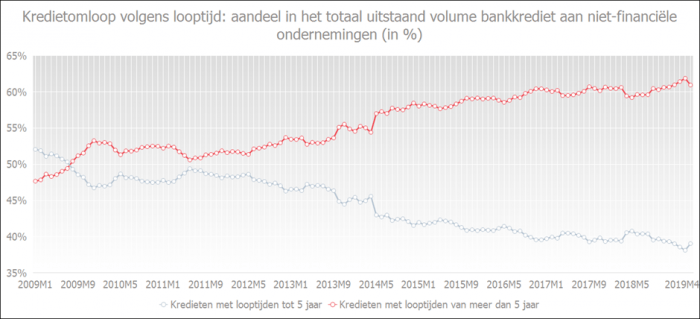 Doordat ondernemingen langere tijd van deze lage rente willen genieten, vragen ze vooral bankkredieten aan met een lange looptijd (meer dan 5 jaar). Toch namen ze in 2018 opnieuw meer krediet op korte termijn (tot 1 jaar) op.