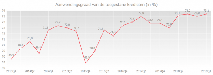 Toch werd deze stijging niet doorgetrokken naar het aantal aangevraagde kredieten. De ondernemingen hadden minder nood aan financiering en vroegen in het eerste trimester van 2019 1,1% minder kredieten aan dan in dezelfde periode in 2018. Het overeenstemmende bedrag daalde zelfs met 12,7%. Dit is vooral te wijten aan het uitzonderlijk hoog bedrag aan kredietaanvragen vorig jaar.