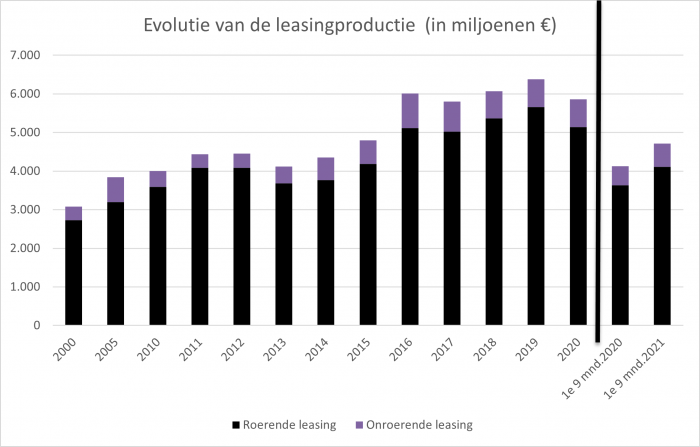 De totale investeringswaarde van de nieuwe leasingcontracten tijdens de eerste 9 maanden van 2021 bedroeg 4,7 miljard euro. Dat is een stijging van ruim 14% ten opzichte van dezelfde periode van 2020 en bereikt het precorona-niveau van 2019.