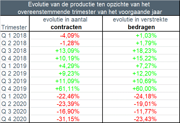 Vergeleken met het uitzonderlijke vierde trimester van 2019, zijn de verstrekte hypothecaire kredieten in het vierde trimester van 2020 vanzelfsprekend fors in aantal gedaald, met name -23,5% in aantal en -31% in bedrag.