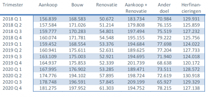 Het gemiddelde bedrag van een krediet voor de bouw van een woning kende in het vierde trimester van 2020 een verdere stijging tot bijna 198.000 EUR. Dit vormt een stijging met bijna 30.000 EUR sinds begin 2018.
