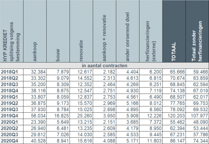 Vergeleken met het vierde trimester van 2018 daarentegen gaat het om een stijging voor alle bestemmingen : het aantal kredieten voor de aankoop van een woning (+2.412) lag in het vierde trimester van 2020 meer dan 6% hoger dan in het vierde trimester van 2018. Het aantal kredieten voor aankoop met verbouwing (+1.337) kende een stijging met zelfs 48,6%, evenals het aantal renovatiekredieten (+3.069, hetzij +24,5%), terwijl het aantal bouwkredieten (+266) 3% hoger lag. Het aantal kredieten voor andere doeleinden (+241) kende een stijging met bijna 5% ten opzichte van het vierde trimester van 2018.