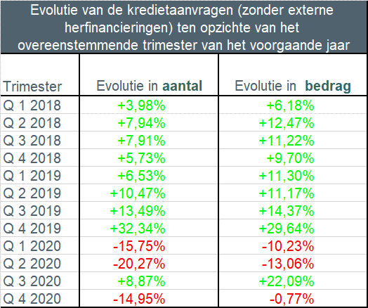 Het aantal kredietaanvragen, zonder deze die betrekking hadden op een externe herfinanciering, kende in de loop van het vierde trimester van 2020 een daling met bijna 15% ten opzichte van hetzelfde trimester van vorig jaar. Het onderliggende bedrag van de kredietaanvragen daalde echter nauwelijks met 0,8%.