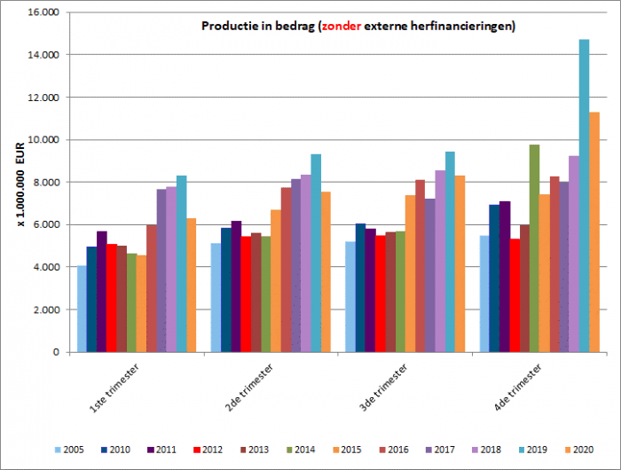 Herfinancieringen buiten beschouwing gelaten, daalde het aantal kredietaanvragen in 2020 weliswaar met ongeveer 11% ten opzichte van 2019, maar het lag wel meer dan 3% hoger dan in 2018. In bedrag was er een daling met nauwelijks 0,6% ten opzichte van 2019, en zelfs een stijging met 16% ten opzichte van 2018.