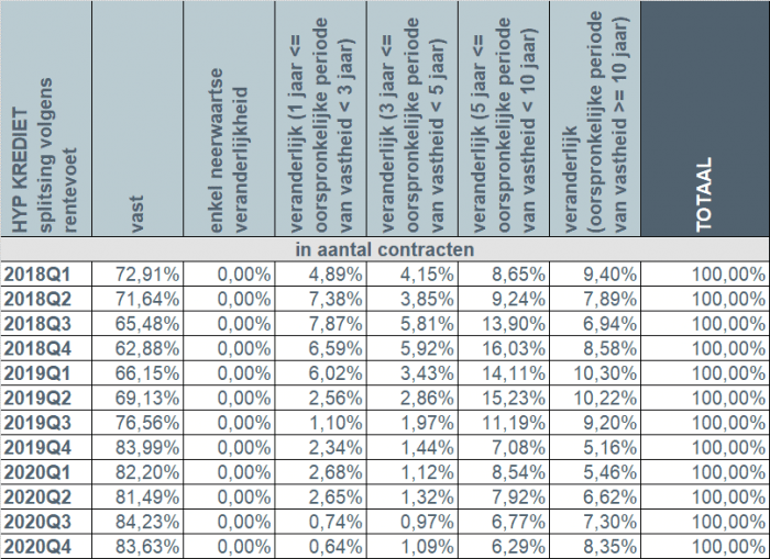 In het vierde trimester van 2020 kozen opnieuw meer dan 9 op 10 kredietnemers (92%) voor een vaste rentevoet of een veranderlijke rentevoet met een initiële periode van rentevastheid van minimum 10 jaar. Iets meer dan 7% van de kredietnemers opteerde voor een veranderlijke rentevoet met een initiële periode van rentevastheid tussen 3 en 10 jaar. Het aantal kredietnemers dat voor een jaarlijks veranderlijke rentevoet opteerde viel terug tot nauwelijks 0,6%.