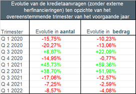 Het aantal kredietaanvragen, zonder deze die betrekking hadden op een externe herfinanciering, kende in de loop van het eerste trimester van 2022 een daling met 8,5% ten opzichte van hetzelfde trimester van vorig jaar. Het onderliggende bedrag van de kredietaanvragen daalde eveneens met 4%.