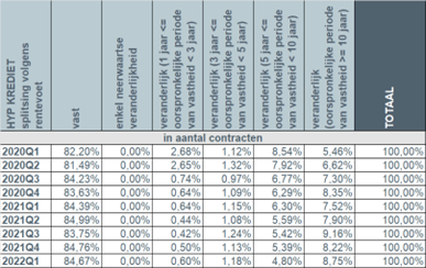 In het eerste trimester van 2022 kozen opnieuw meer dan 9 op 10 kredietnemers (93,5%) voor een vaste rentevoet of een veranderlijke rentevoet met een initiële periode van rentevastheid van minimum 10 jaar. Ongeveer 6% van de kredietnemers opteerde voor een veranderlijke rentevoet met een initiële periode van rentevastheid tussen 3 en 10 jaar. Het aantal kredietnemers dat voor een jaarlijks veranderlijke rentevoet opteerde bedraagt slechts 0,6%.