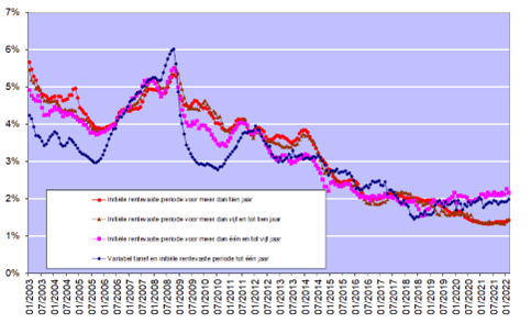 Rekening houdend met de nog steeds zeer lage rentevoeten (zie grafiek hierna) blijft de Belgische consument dus in overgrote mate kiezen voor zekerheid. Het aantal personen dat nog opteert voor een veranderlijke rentevoet blijft laag, zeker wat de jaarlijks veranderlijke rentevoet betreft. Maar ook in geval van een veranderlijke rentevoet wordt de consument door de wetgeving ten zeerste beschermd. Zo kan de veranderlijke rentevoet na aanpassing aan de evolutie van de toepasselijke referte-indexen nooit meer bedragen dan het dubbele van de initiële rentevoet.