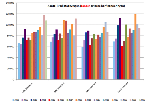 Het aantal kredietaanvragen (excl. deze voor herfinancieringen) is in het eerste trimester van 2022 gedaald met 8,5% ten opzichte van het eerste trimester van 2021. Het bedrag van de kredietaanvragen daalde eveneens met ongeveer 4% ten opzichte van 2021. Er werden zodoende bijna 108.000 kredietaanvragen ingediend voor een totaalbedrag van 19 miljard EUR.