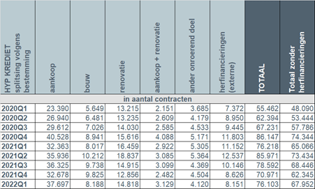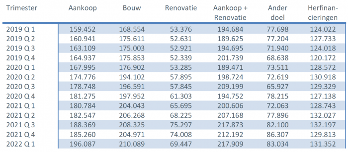 Het aantal kredieten voor de aankoop van een woning (+5.334) lag in het eerste trimester van 2022 16,5% hoger dan in het eerste trimester van 2021. Het aantal kredieten voor aankoop met verbouwing (+207) kende een stijging met 7%, terwijl het aantal bouwkredieten (+171) 2% hoger lag. Het aantal kredieten voor andere doeleinden (-1.185) kende een daling met 22,3%. Het aantal kredieten voor de renovatie van een woning kende eveneens een daling, nl. -10% of 1.641 kredieten minder dan in het eerste trimester van 2021.