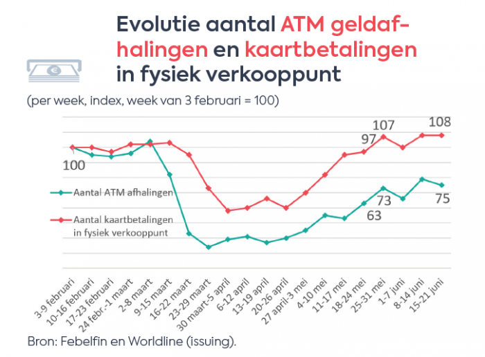 Febelfin roept alvast op om zo veel mogelijk digitaal (via de kaart en de smartphone) te blijven betalen, ook nu de meeste handelaars en verkooppunten opnieuw de deuren hebben geopend.
