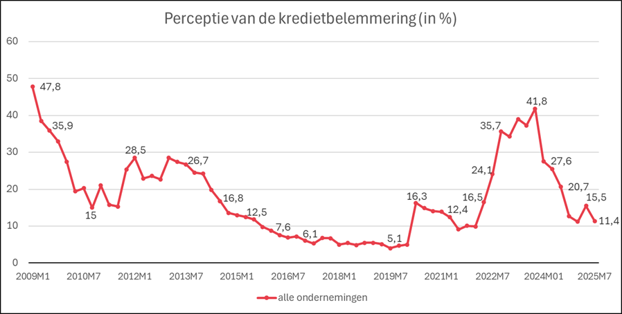 Langs de andere kant blijkt uit de resultaten van de kwartaalenquête van de Nationale Bank van België (NBB) over de perceptie van de kredietbelemmeringen bij ondernemingen, dat de banken hun kredietvoorwaarden licht zouden hebben versoepeld. Het deel van de ondernemingen die de kredietvoorwaarden als ongunstig beschouwden, was in juli 2025 gedaald tot 11,4%. In mei 2025 lag dit percentage nog op 15,5%.