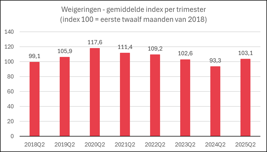 Langs de ene kant lag de weigeringsgraad in het tweede trimester van 2025 iets hoger dan in het tweede trimester van 2023 en 2024, maar uiteindelijk blijft de weigeringsgraad wel op een laag niveau.