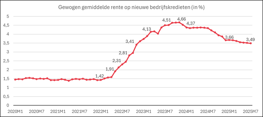 De gewogen gemiddelde rente op nieuwe bedrijfskredieten had in november 2023 een piek bereikt van 4,66%. In juli 2025 was die gemiddelde rente reeds meer dan 1 procentpunt gedaald tot 3,49%. De rente voor bedrijfskredieten volgt hiermee de daling van de beleidsrentes van de Europese Centrale Bank en volgt de stijging van de rentes op lange termijn overheidsobligaties niet.