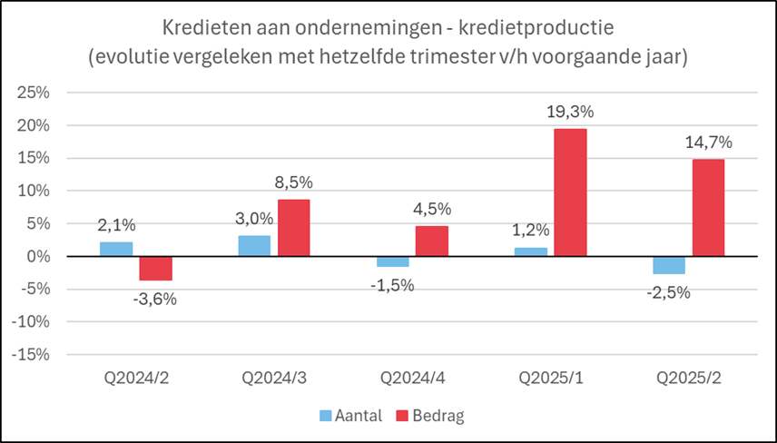 De stijging in bedrag betekent echter niet dat er zich ook een stijging optekende in het aantal aangevraagde en verstrekte kredieten. In het tweede trimester van 2025 werden er 9,0% minder ondernemingskredieten aangevraagd dan in dezelfde periode van 2024. Het aantal verstrekte kredieten daalde met 2,5%.