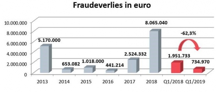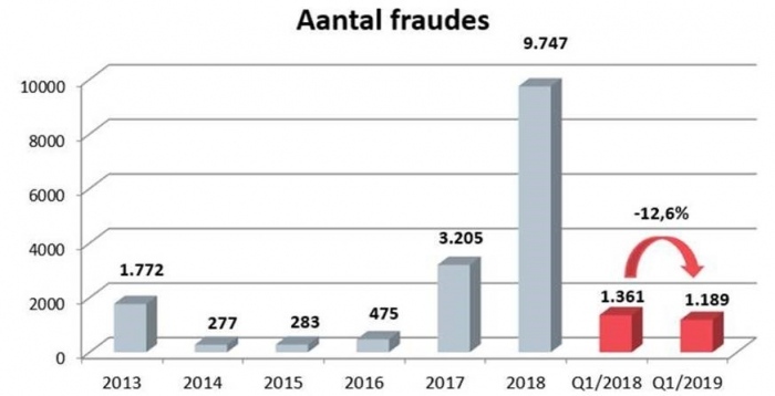 Hoewel deze cijfers hoog blijven, is er wel een daling van 12,6% (aantal fraudegevallen) en 62,3% (fraudebedrag) tegenover een jaar eerder.