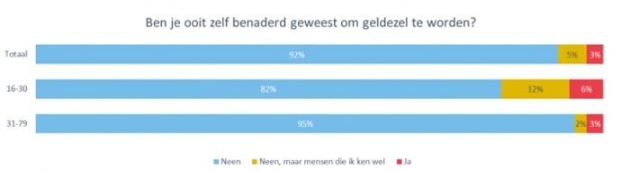 In hetzelfde onderzoek geeft 3% van de bevolking aan ooit benaderd te zijn met de vraag om geldezel te worden. Bij de jongeren ligt dit fors hoger: 6% is zelf benaderd en nog eens 12% kent iemand die ooit benaderd werd.