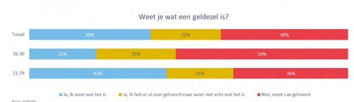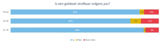 Bij de vraag of geldezel worden strafbaar is, gelooft 10% van de volwassenen van niet. En maar liefst 19% van de jongeren heeft geen idee of denkt dat het niet strafbaar is.
